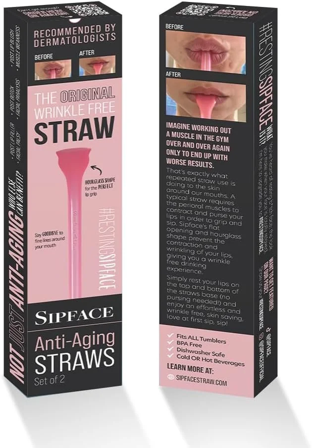 The SipFace Wrinkle-Free Straw is a beauty and wellness straw designed to help prevent lip wrinkles and preserve cosmetic results by reducing repetitive puckering motions — while also offering medical benefits for those recovering from lip injections, dental work, or oral sensitivity.