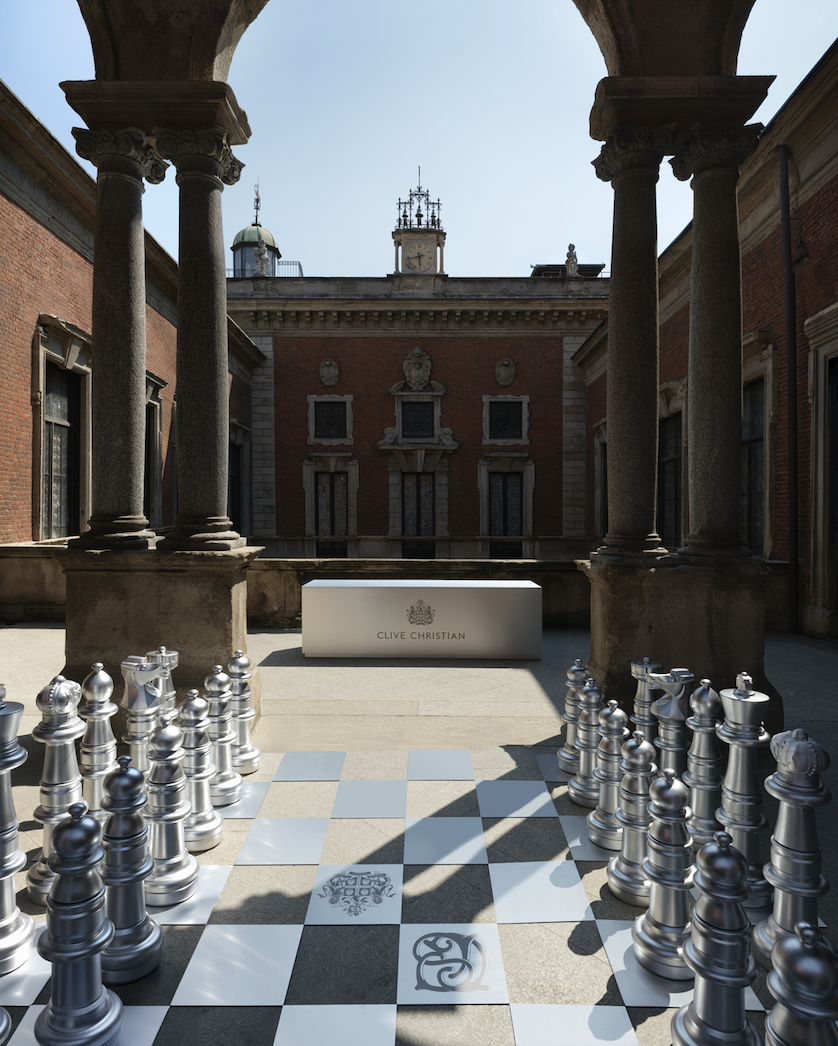 In an immersive installation called Transformism, a life-size chessboard unfolds across the terrace of Museo Bagatti Valsecchi. Large silver pieces glide across the board, anchoring the colored squares just as one of Clive Christian’s scents sits on the skin – their crowns the direct echo of the brand’s iconic perfume bottle. It's a quiet nod to the brand's royal British heritage, and to something older than that: the idea that true luxury doesn't just look the part. It holds its position.