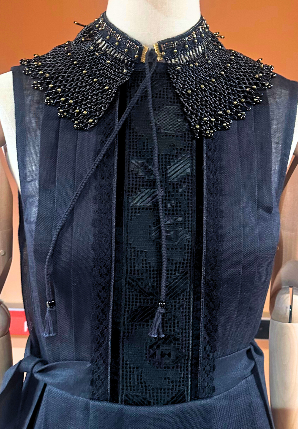 Across the room, the mood shifted. Khrystyna Rachytska's self-titled brand is the complete opposite. Her work feels like quiet power – full of intricate embroidery, texture, and depth. Her designs are created from natural materials and traditional techniques that reflect Ukraine's history.