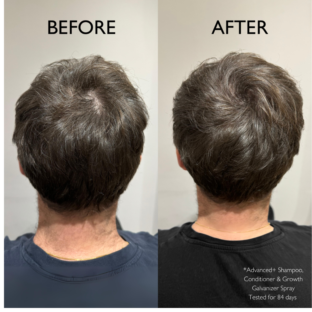 The final step is to use the Galvanizer spray. This spray protects the scalp and ignites active properties. The Procapil properties, aid hair follicle metabolism. The use of ingredients targets stem cells with human fibroblasts. The final product is visibility thicker stronger stronger-looking hair.