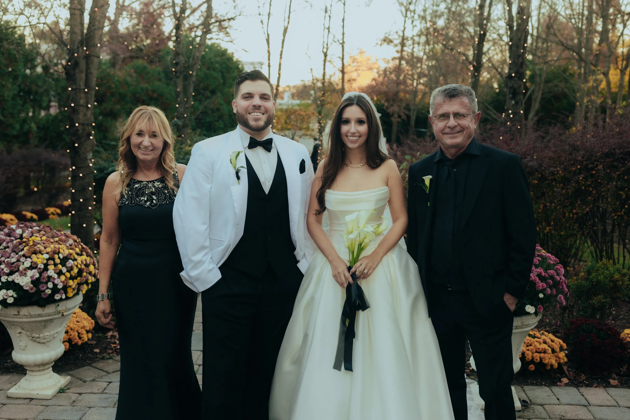An elegantly refined celebration! Kelly Barruffe and Michael Barbieri exchanged vows on November 1, 2024, marking the beginning of their everlasting love story. Their wedding exuded a sophisticated style. Groomsmen, bridesmaids, and guests all dressed in classic black attire, creating a striking visual against a backdrop of black fabrics, accented by gold candelabras, black silk bows, and delicate arrangements of baby’s breath and calla lilies.