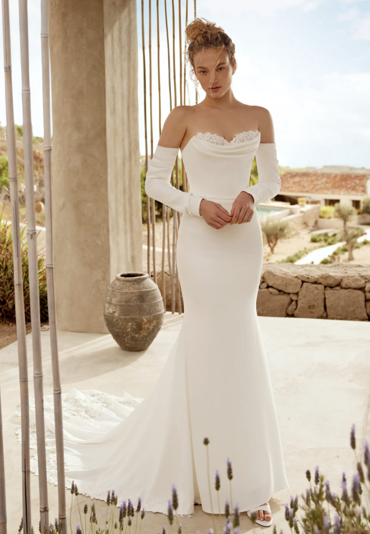 Style 66360: Effortless Elegance with a Bold Back. For a touch of drama and sophistication, this dress delivers with its daring open back and flowing skirt. The gown combines a bold statement with an airy, effortless vibe, making it perfect for beach or garden weddings where a soft breeze can add to the gown’s ethereal movement.
