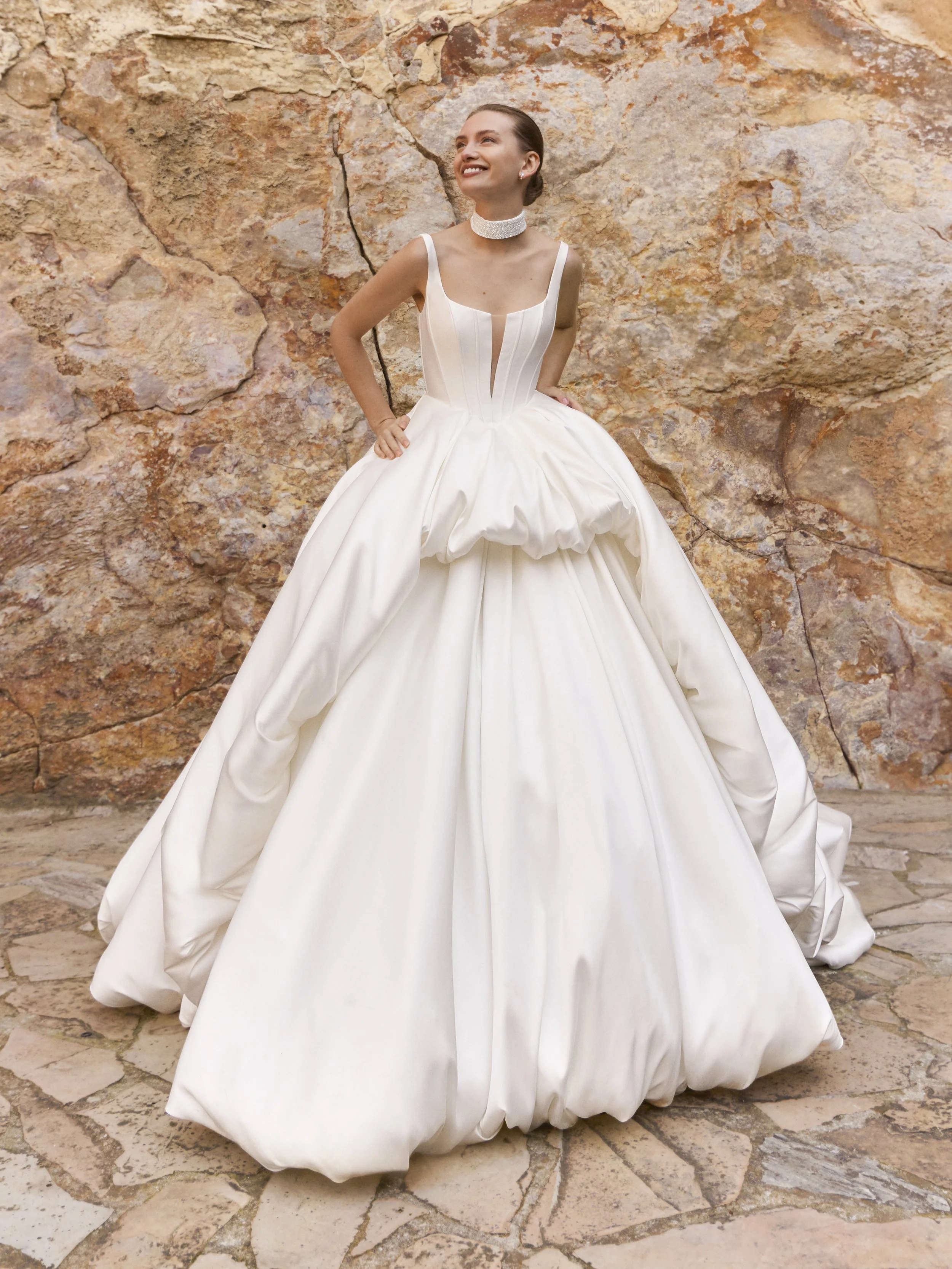Clean, architectural lines are softened by flowing skirts and delicate necklines, while structured corsetry and intricate embroidery ground each piece in couture craftsmanship. The result is a collection that feels both sculptural and effortless—designed for a bride who is confident, multifaceted, and entirely her own.