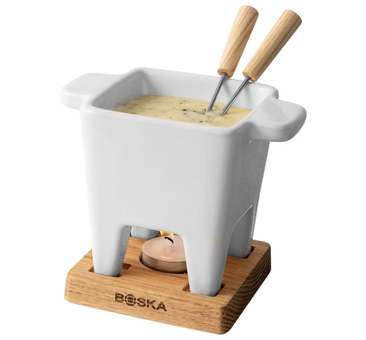 With the Tapas Fondue Bianco, you can serve a unique cheese fondue snack for two or a meal for one. The ceramic fondue pot can be used in the microwave and has a capacity of 10.5 fl oz. That's large enough for around 6 oz of cheese fondue or 6.75 fl oz of warm sauce. This compact fondue set has a high-quality base made of European oak. Simply dip your favorite meat or veggies in the fondue using the fondue forks (two forks included). Not only is this great for traditional cheese or chocolate fondue, but the tea light keeps any tasty dip sauce, like satay or mushroom sauce, warm while you eat. The fondue pot can only be used in the microwave and is dishwasher-safe fondue pot and fondue forks should be washed by hand. Wipe down the base with a damp cloth and spray the wood regularly with BOSKA Board Oil (not included). This will guarantee years of delicious fondue and warm sauces!