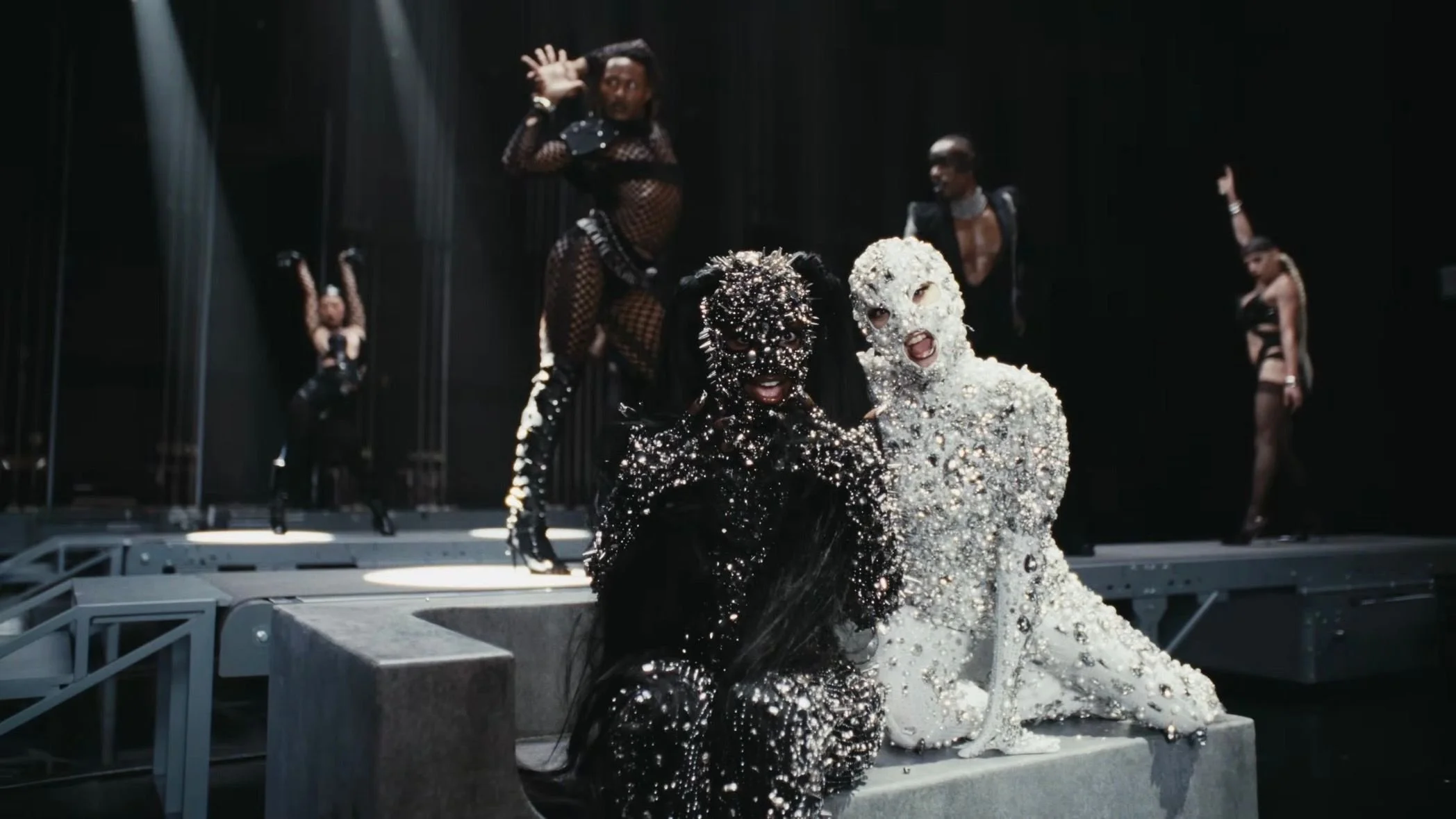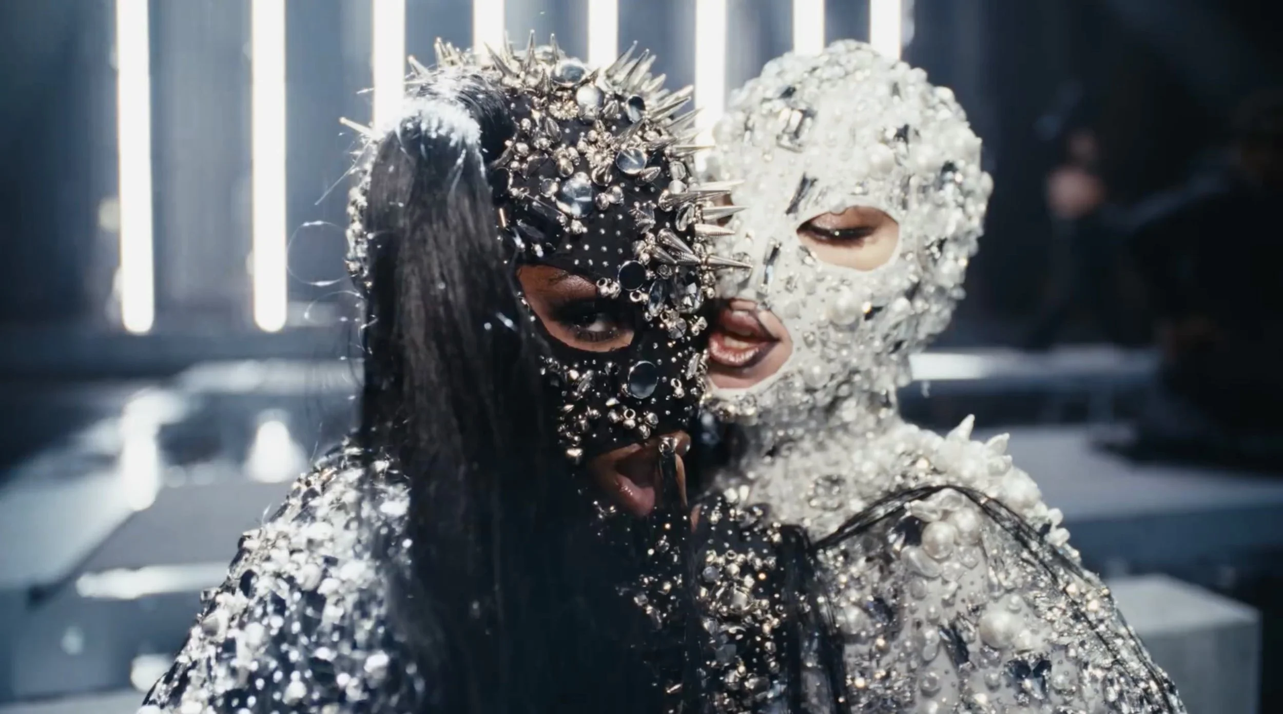 Gaga’s look, rendered in a luminous pearl tone, delivers a soft yet striking radiance, with crystals and pearls catching the light in a fluid, almost ethereal way. In contrast, Doechii’s black bodysuit leans into a sharper, more graphic energy, layered with spikes and metal studs over a base of sequins and crystals, offering a bold counterpoint in both texture and tone.
