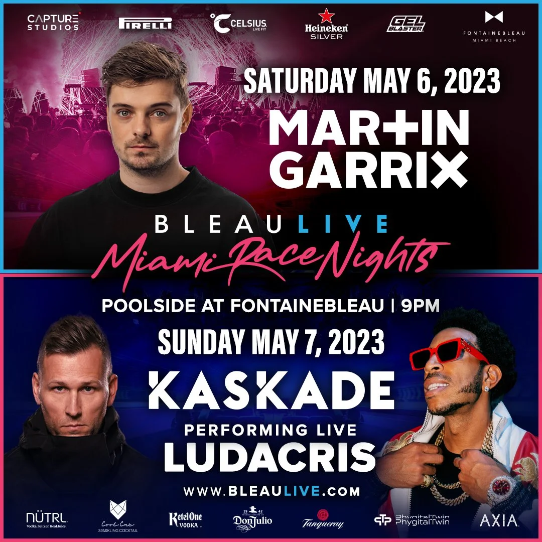 Details: To celebrate Formula 1’s second-annual Miami Grand Prix, BleauLive at The Fontainebleau Miami Beach, in partnership with The Creative and Capture Studios are pleased to announce a three-night, star-studded beachside music experience featuring Martin Garrix and Kaskade. The energized fan fest will take place poolside at The Fontainebleau Miami Beach on Saturday, May 6 and Sunday, May 7, 2023. Doors open at 8 p.m. and the party continues until 1 a.m.