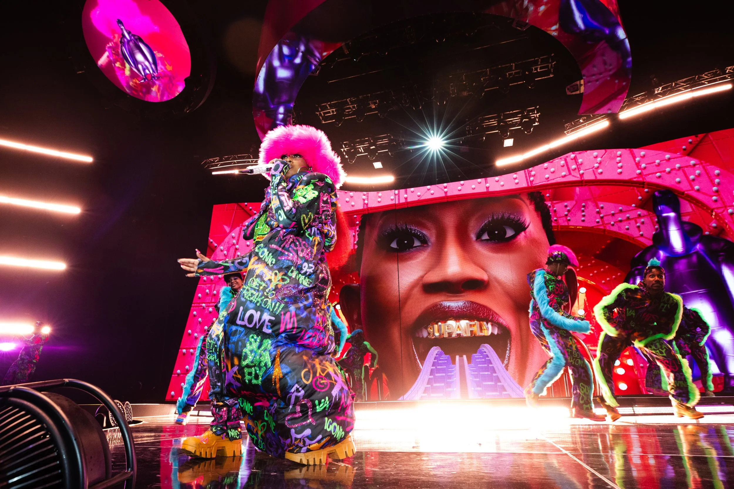 Landing onstage in a virtual spacecraft, Elliott invited sold out crowds to join her on an immersive intergalactic expedition across four different dimensions of her hit-making catalog.