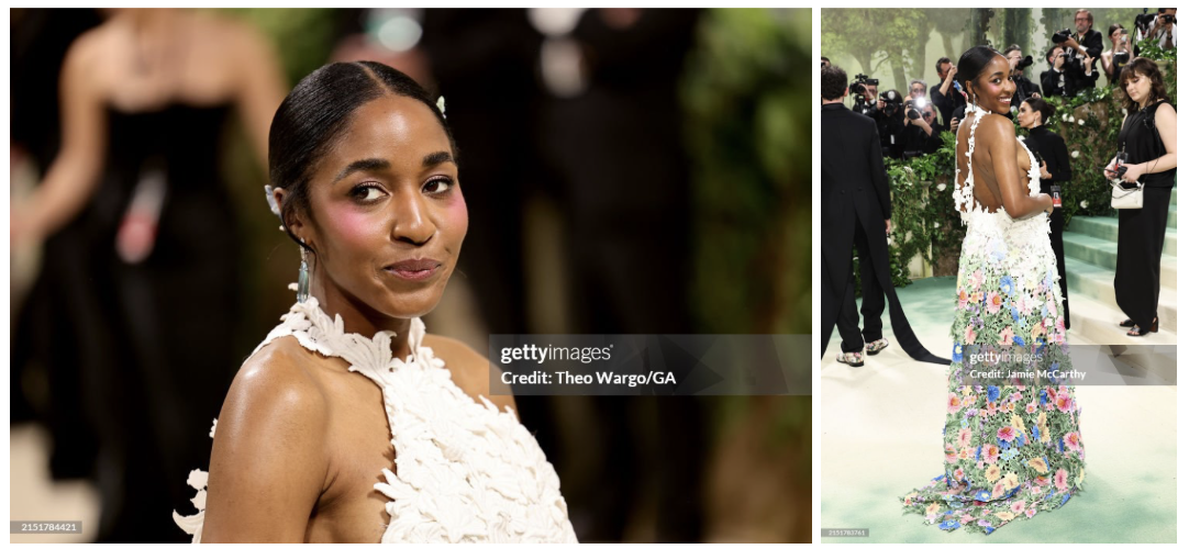 Another anticipated Met Gala attendee was first-time Emmy winner Ayo Edebiri sporting a halter neck floral dress that is elegant and very on-theme. The young actress wore a glowing makeup look with bubble gum pink blush on her cheeks. Her makeup look was curated by Celebrity makeup artist, Dana Delaney using ILIA Beauty products.