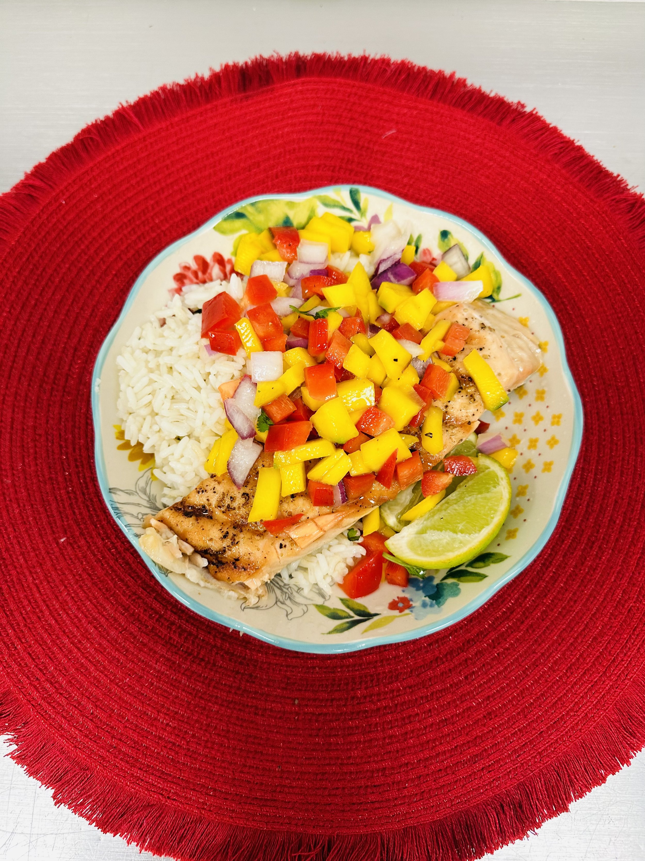 Place salmon into a bowl and top fish with mango salsa and a side of white rice to make your yummy bowl!