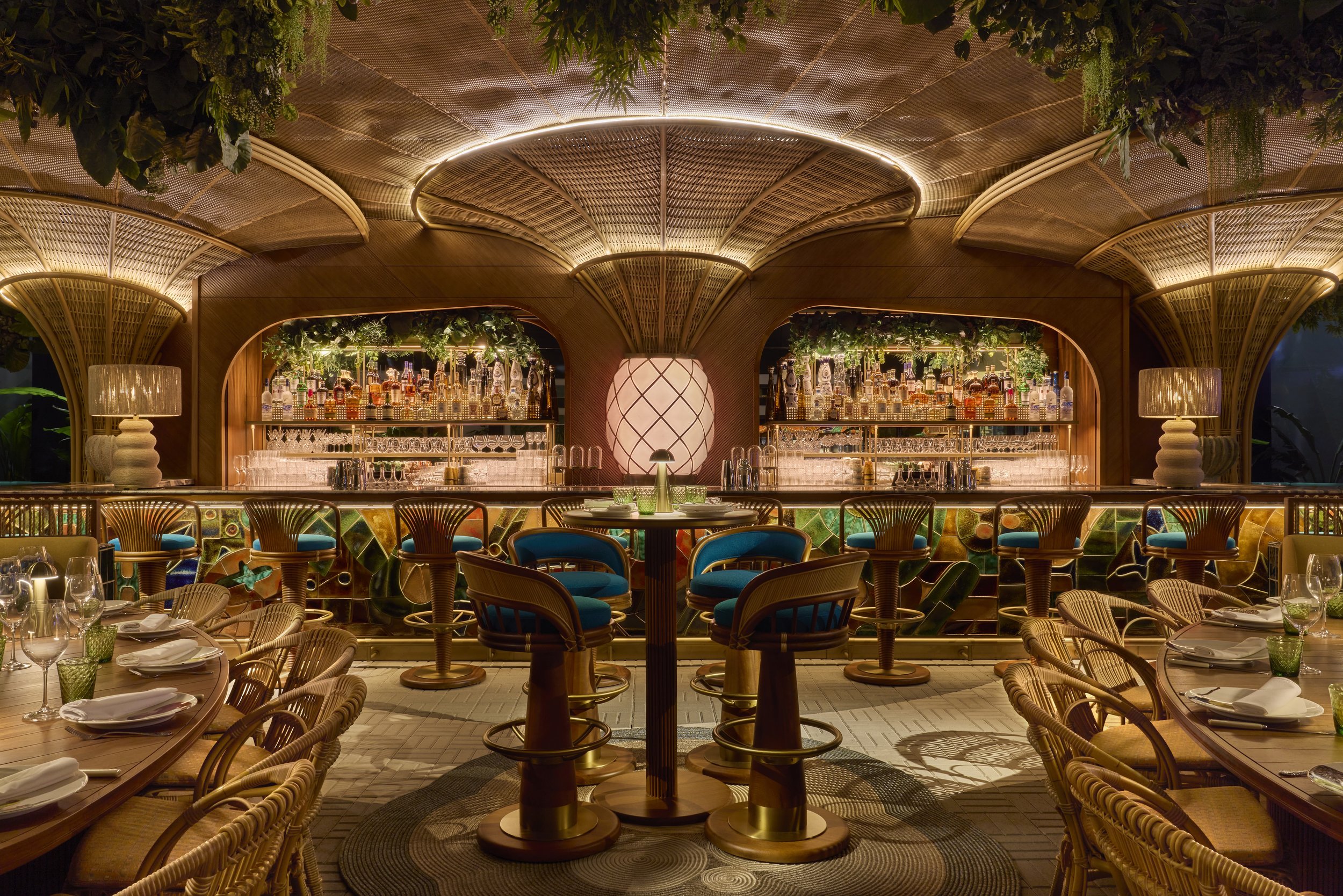 Amazónico llegó a Miami hace unos meses y finalmente fui a conocerlo. Este restaurante brasileño aterrizó en Brickell después de triunfar en ciudades como Madrid, Londres, Dubái y Montecarlo, acompañado de una impresionante decoración de inspiración selvática. Aquí, el diseño interior incorpora una vegetación abundante que cuelga del techo, lámparas de ratán con flecos en tonos cálidos y sillas y banquetas tapizadas en terciopelos verdes y estampados tropicales vibrantes. A esto se suman esculturas de madera, candelabros dorados y formas curvas en los techos que evocan hongos gigantes iluminados, además de una escalera protagonista que conecta los distintos pisos. El resultado es un ambiente maximalista e inmersivo, capaz de transportarta a esa región sudamericana.