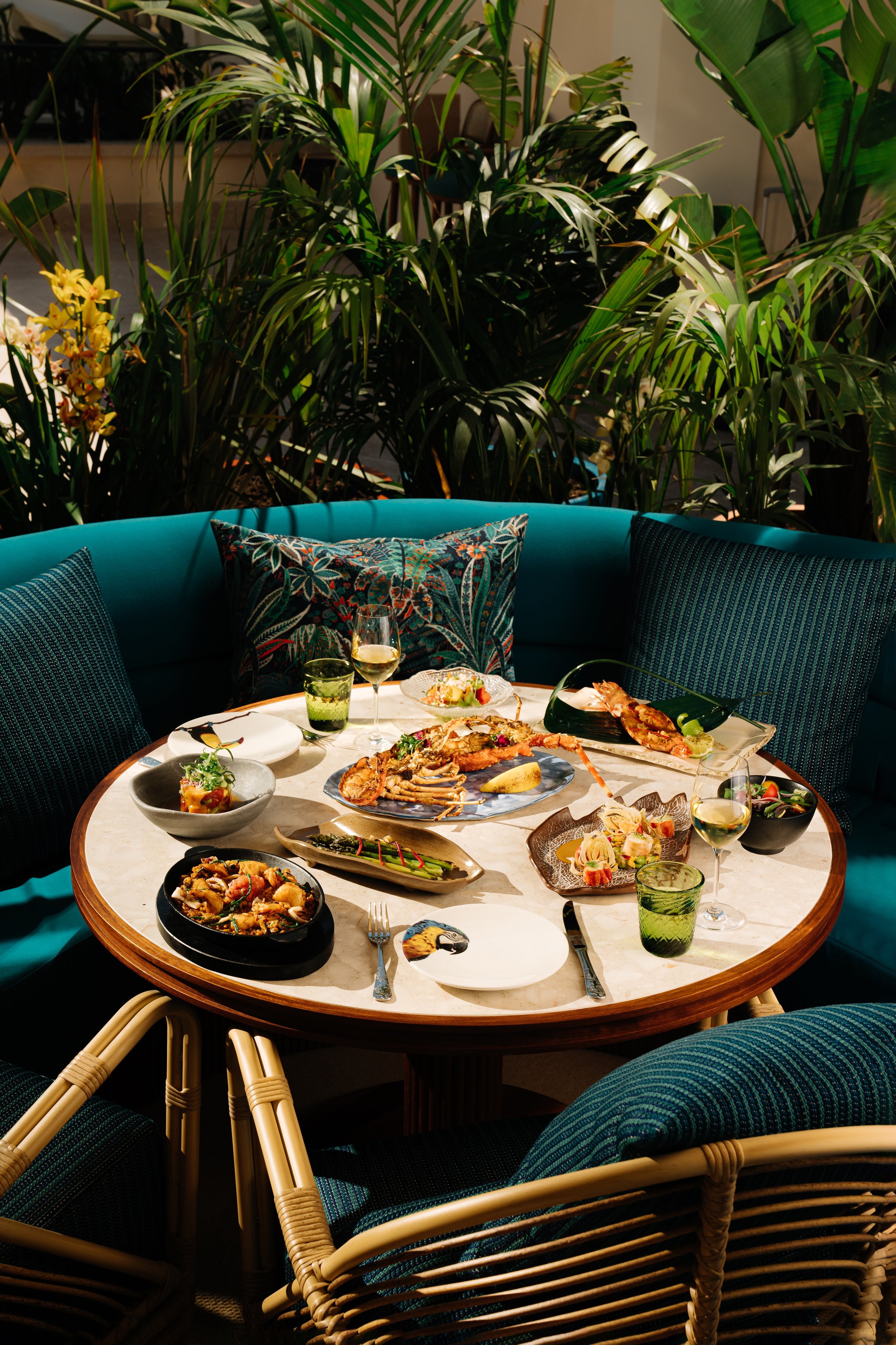 Ahora bien, hablemos de la comida. El menú está inspirado en la biodiversidad del Amazonas y, a partir de ahí, fusiona sabores de Brasil, Perú y Colombia con influencias japonesas, por lo que la carta es amplia y variada. En ella encontrarás carnes a la parrilla, como la picanha rodizio; arroces; opciones de sushi y crudos creativos, como el amazónico maki con mango, nibs de cacao y coco; y, algunos, platos más elaborados, como el gaucho de langosta sobre orzo de sémola en bisque de coco.