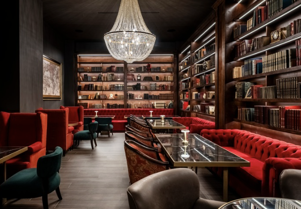 En la parte trasera se encuentra La Biblioteca, un speakeasy inspirado en salones intelectuales de antaño con un aire de sensualidad moderna. Es el corazón de Presidente y alberga una colección de botellas únicas, desde ediciones limitadas hasta etiquetas icónicas.