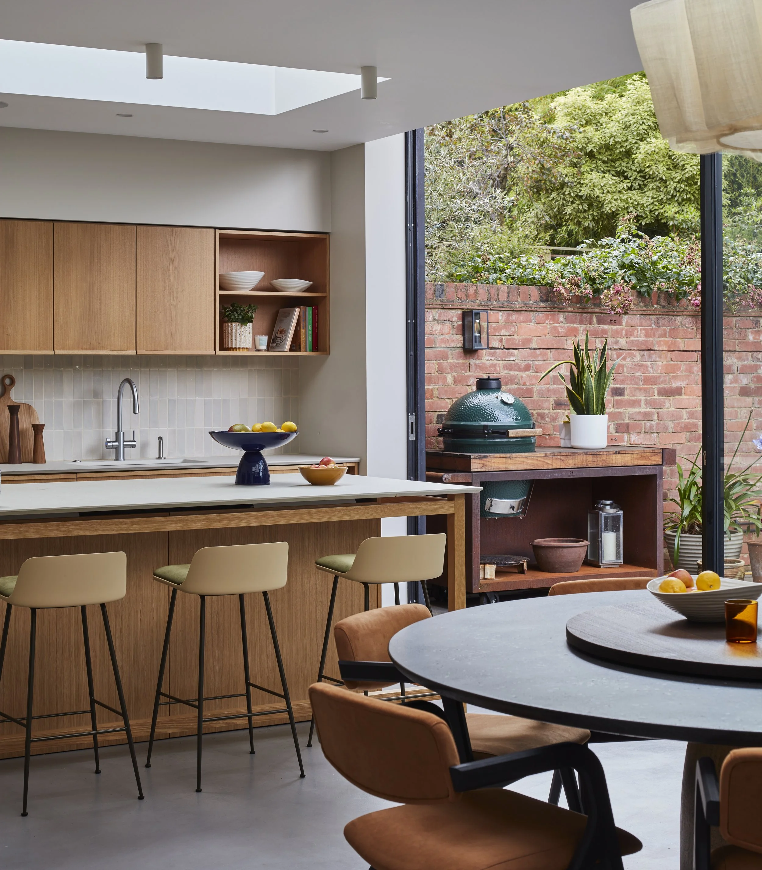 A bespoke kitchen, island, and hidden breakfast area designed by Black and Milk incorporate richer materials to add a layer of warmth to the family's open-plan dining area. To keep the design cohesive with the front of the house, traditional backsplash tiles were implemented to the modern design of the kitchen. An impressive golf leaf-based table anchors the centre of the dining area with a soft, napkin-like pendant sits a top, softening the overall look and feel.