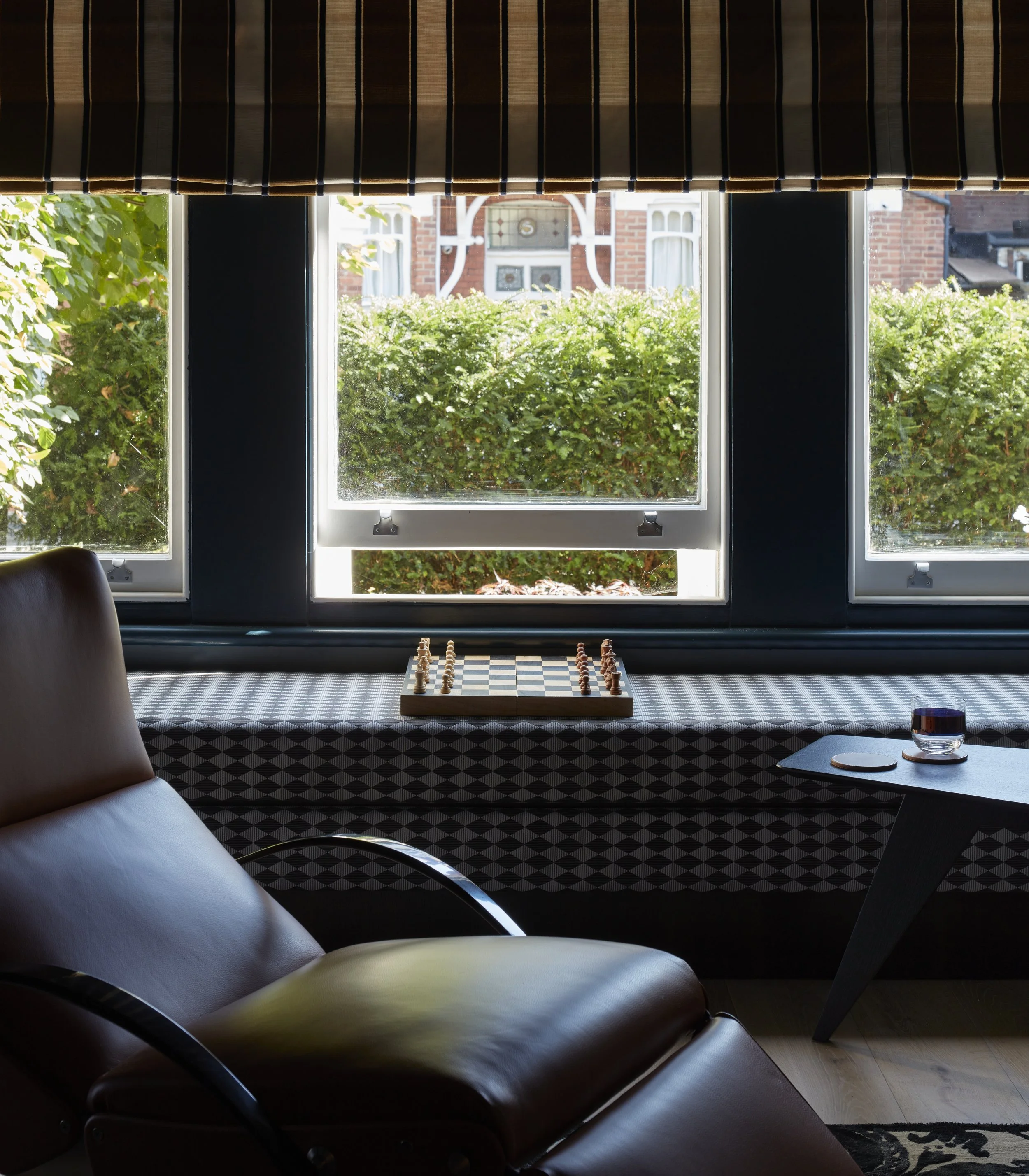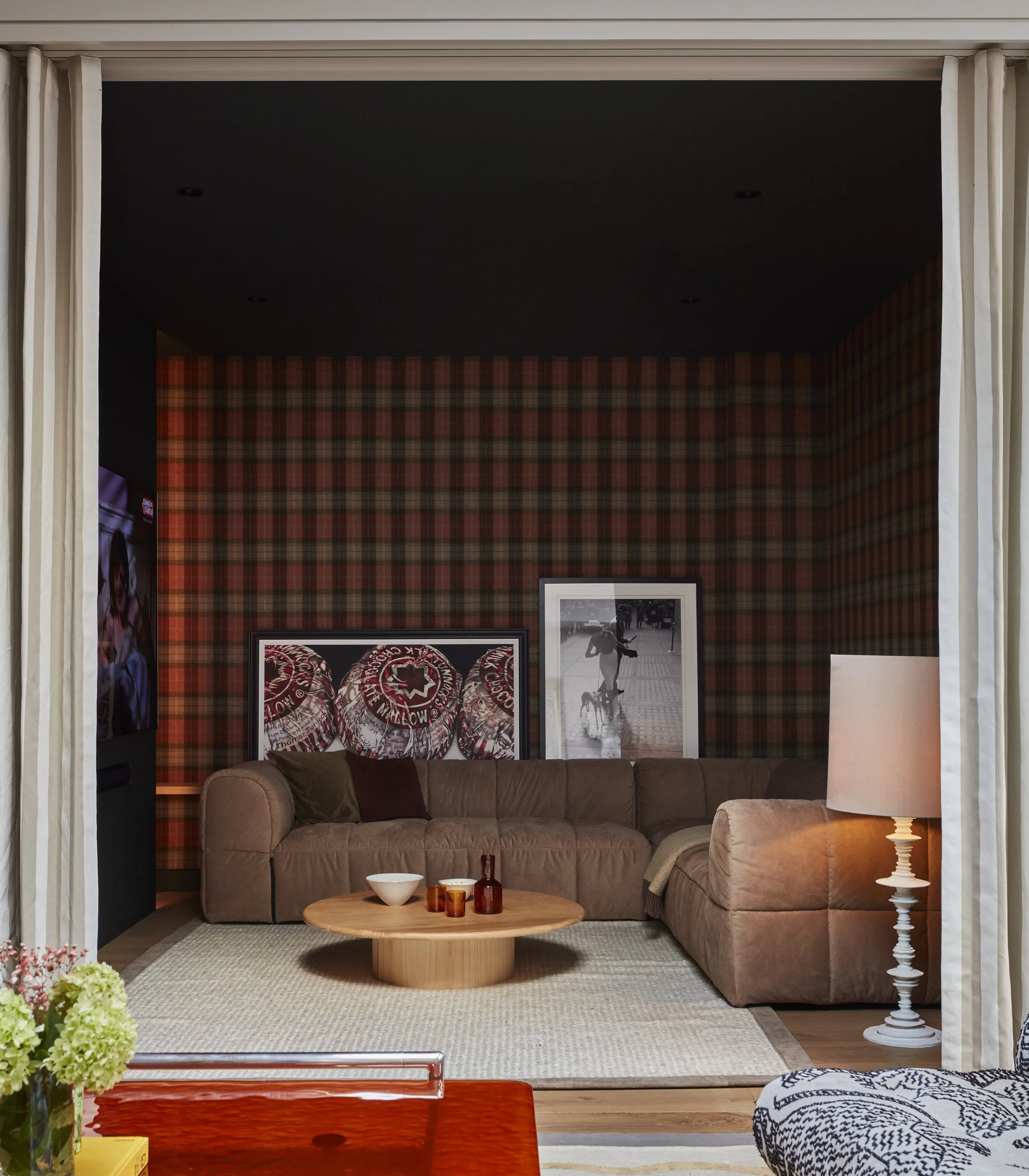 Hidden away within the lounge area, sits a cinema room. The walls were draped and upholstered in Tartan fabric panelling to provide sound installation and pay heritage to the client's Scottish roots.