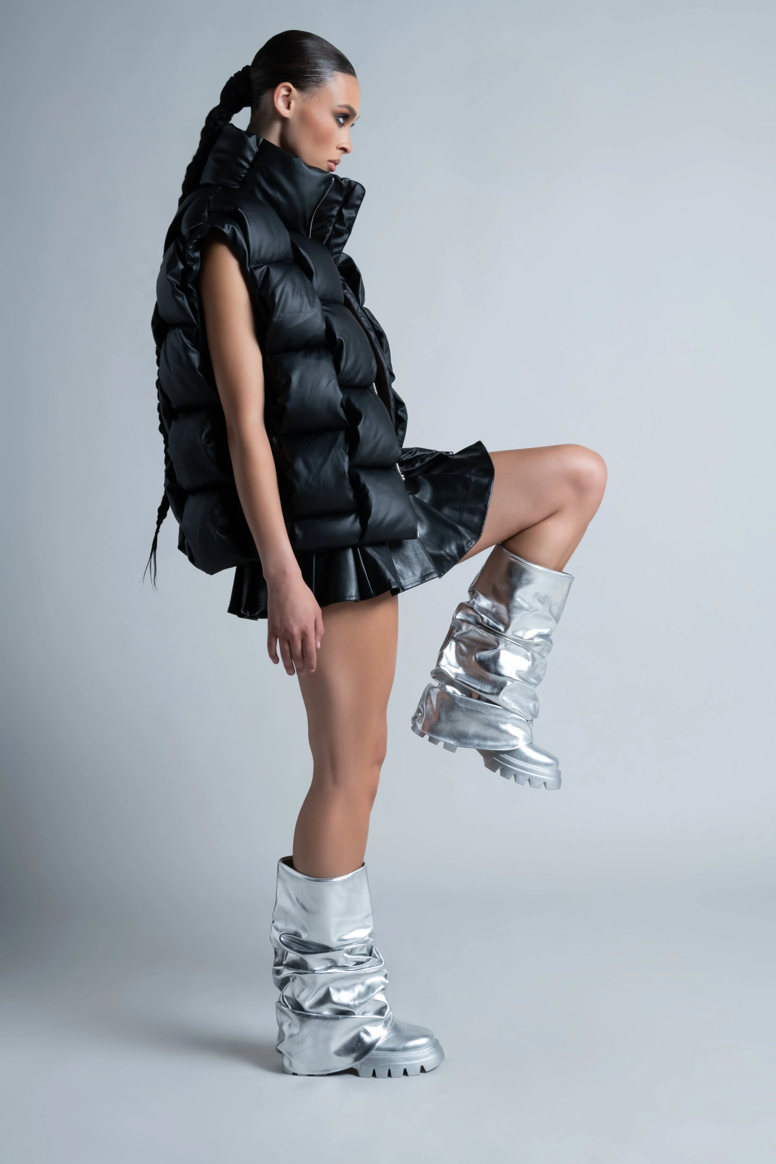 A standout feature of Fall Fol-Edge is the introduction of three brand-new boot styles. The first, a chunky silver knee-high boot, demands attention and exudes confidence with every step. It's a daring choice for those looking to make a bold statement this fall.