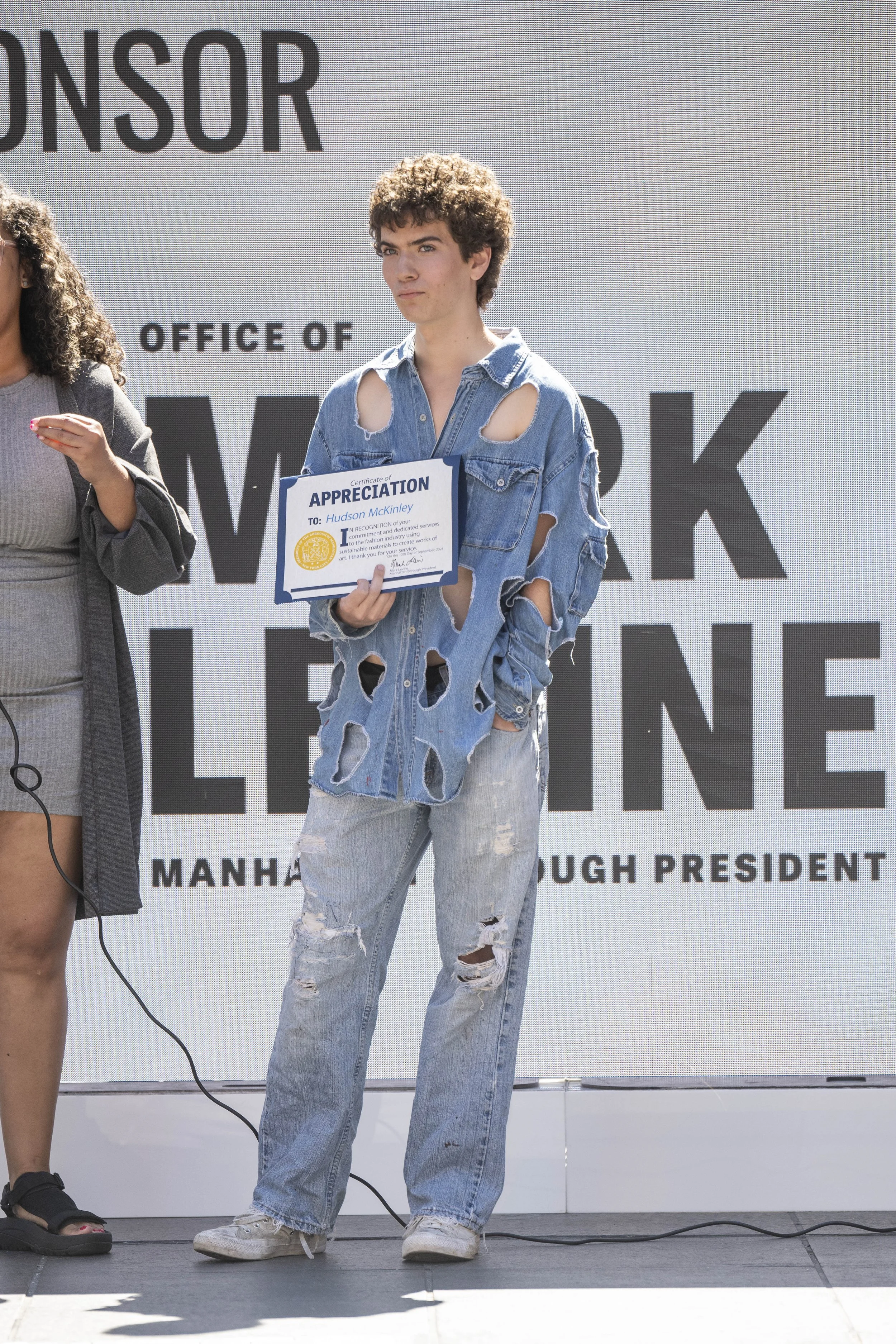 Hudson McKinley-Uss, a lifelong New Yorker and recent graduate of LaGuardia Arts High School, is an up-and-coming designer now in his first year at Parsons School of Design. His standout creation, the MetroCard Dress—crafted entirely from MTA MetroCards and paired with matching glasses and earrings—reflects his unique aesthetic of transforming everyday objects into bold fashion statements. Hudson has explored diverse materials like plastic bottles, ties, and denim, with three pieces showcased at Times Square Fashion Week, earning accolades from local officials. Passionate about the drag scene, he hopes to design garments for Drag Queens and performance artists. While his work subtly critiques consumerism and promotes individual creativity, it has already gained recognition, with the MetroCard Dress worn by social media influencer Griffin Maxwell Brooks and NYC nightlife columnist Linux.