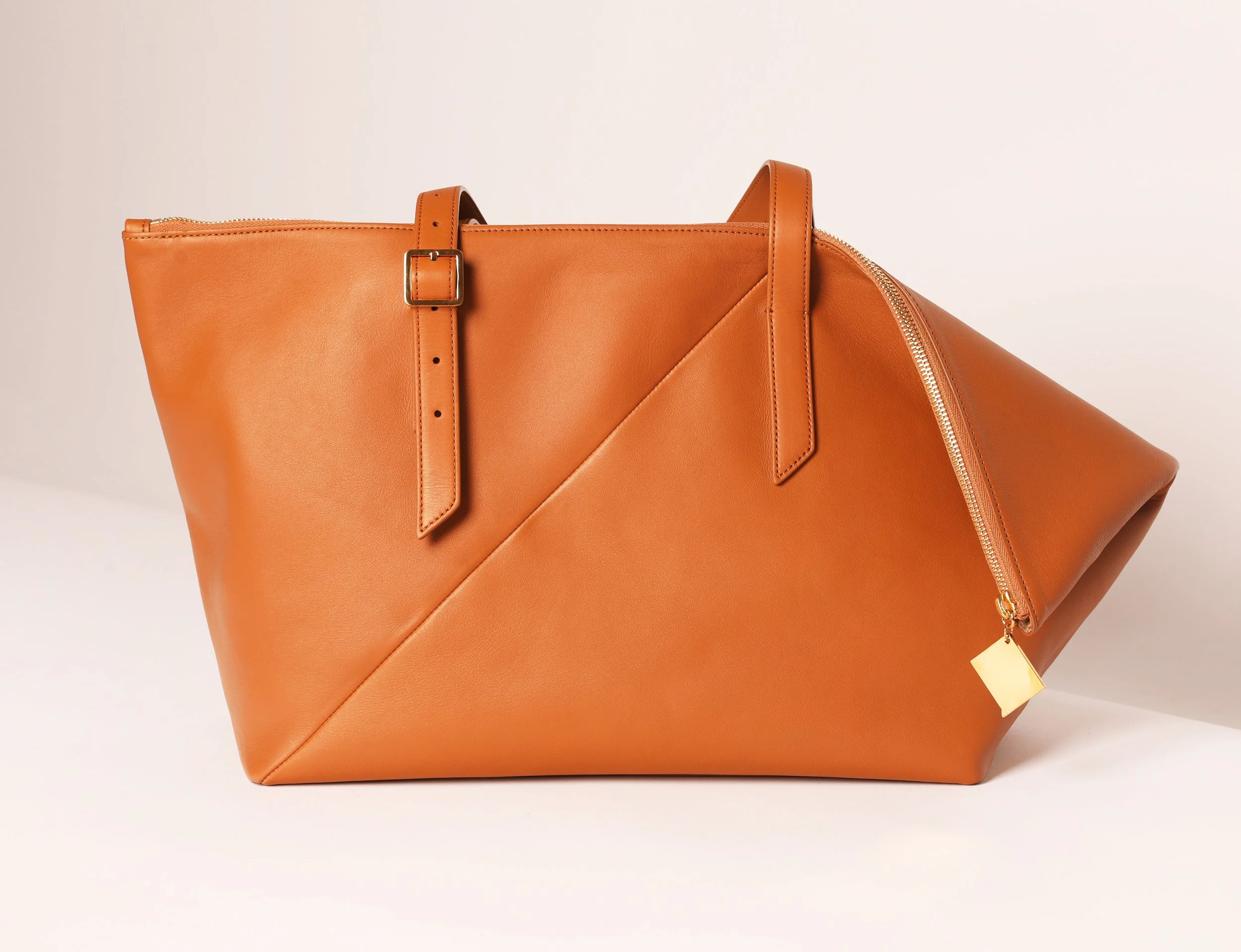 Functional meets fashion-forward in this asymmetrical tote with adjustable straps and Grey/Ven’s signature diagonal seam. Available in black or cuoio calf leather.