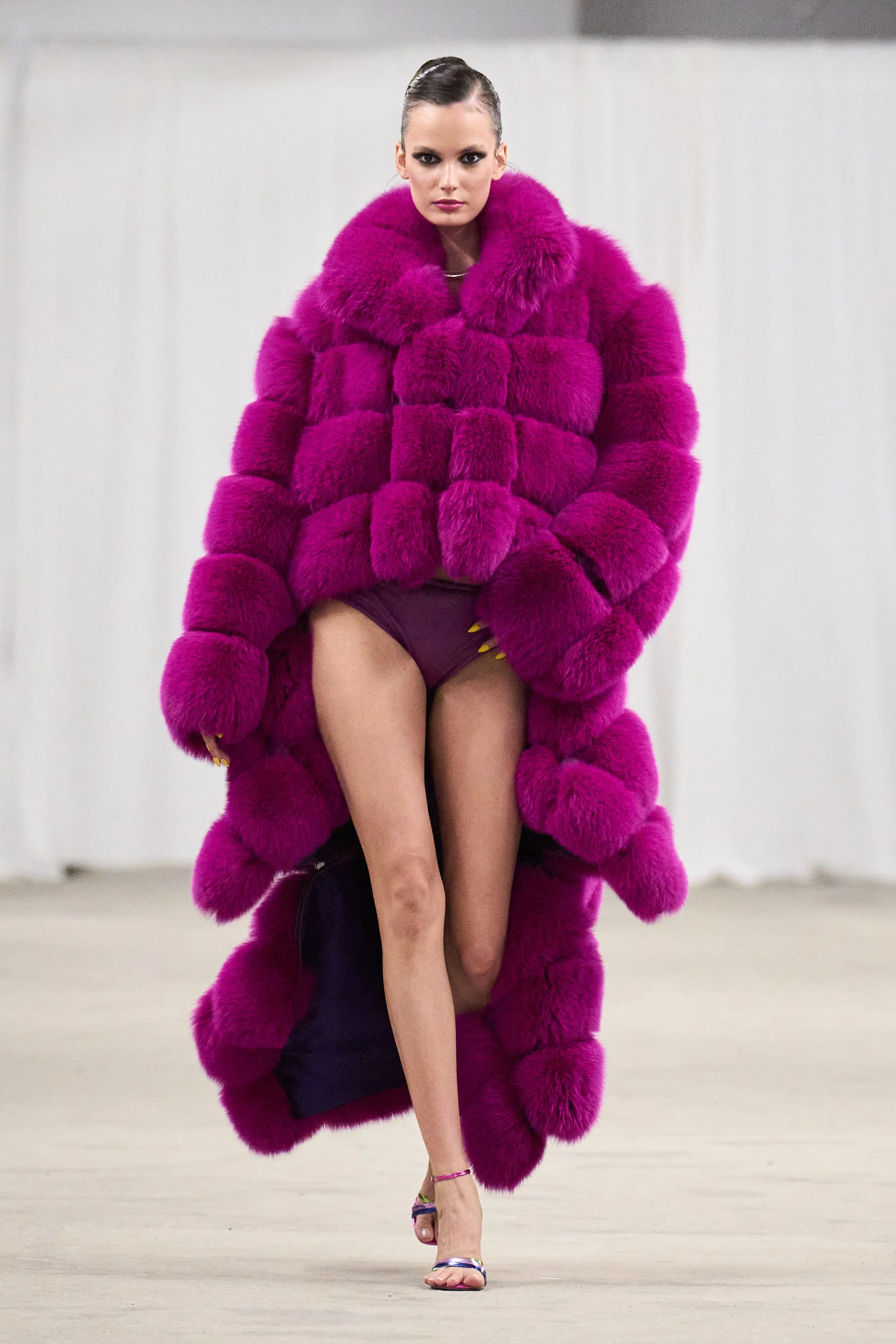 The collection featured intricate leatherwork and various materials such as; silk, wool, and denim. Basse notoriously used black but also incorporated tones of pink, blue, green, and even a sheer metallic. Each model wore a custom chain link in collaboration with Mr.O Altelier. The most memorable piece of the show was divided between a pale baby pink leather jumpsuit and a 2 piece leather gown paired with a headpiece. The show concluded with recycled fur pieces that Basse made by Tas Kletsdis.