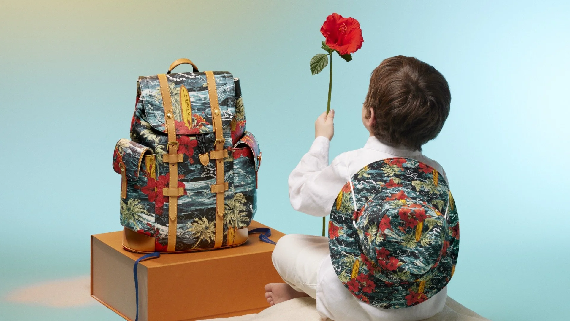 For longer getaways, special editions of essentials such as the Monogram Keepall, the Christopher backpack, the Horizon cabin bag, and the Locker Dopp Kit feature the "Surfin' Monogram" print from the Pre-Fall 2024 collection, starring LV surfboards, palm trees, and exotic flowers set against a sandy beige ground or rolling navy blue waves.