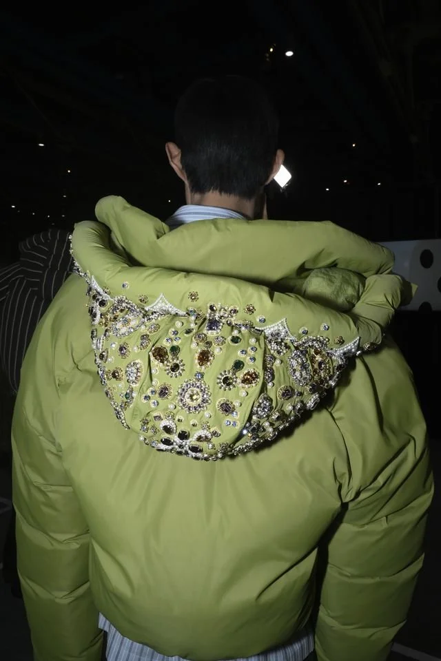 Heavily inspired by the concept of “glamping,” a pivotal part of the collection features outdoor wear elevated to the highest standards. Mountaineering culture is present in India, but when brought to Paris, Williams heightens the garments with opulent embellishments and meticulous embroidery. An olive green puffer coat, though seemingly minimal from the front, is embellished with semi-precious gemstones on the hood. Intricately detailed shell jackets, weatherproof fleece-like blousons, and hiking boots are showcased in the collection, reflecting the spirit of the traveler. The collaboration between outdoor wear and opulence creates a striking contrast, instinctively aligning with Louis Vuitton’s commitment to sartorialism.