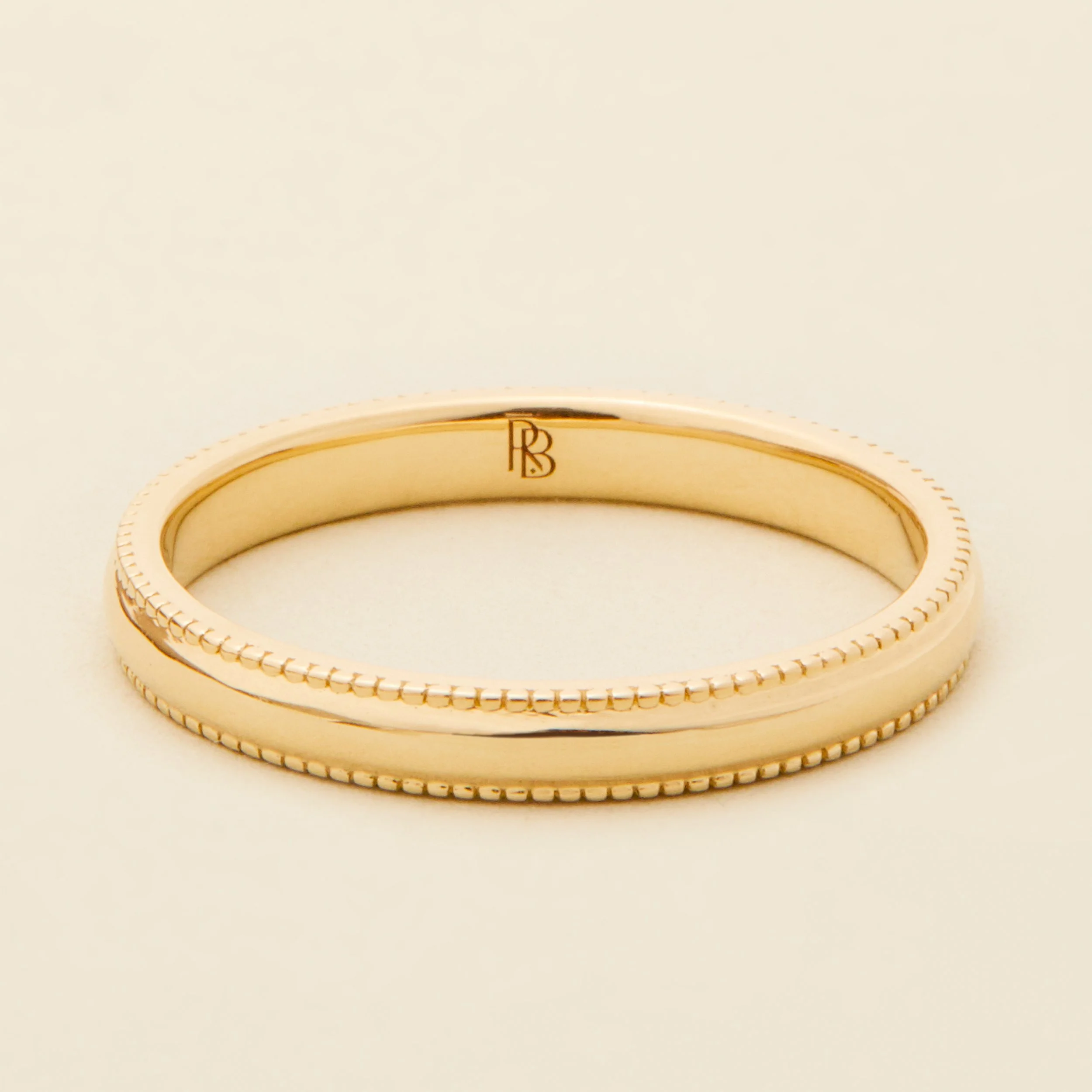 Made from recycled gold, this wedding band for men is a best-seller among Ring Bear’s collection. It features a timeless shape with an elevated border for fine contrast and texture. Perfect for the discerning man who values both style and sustainability. Also available in white gold and platinum.