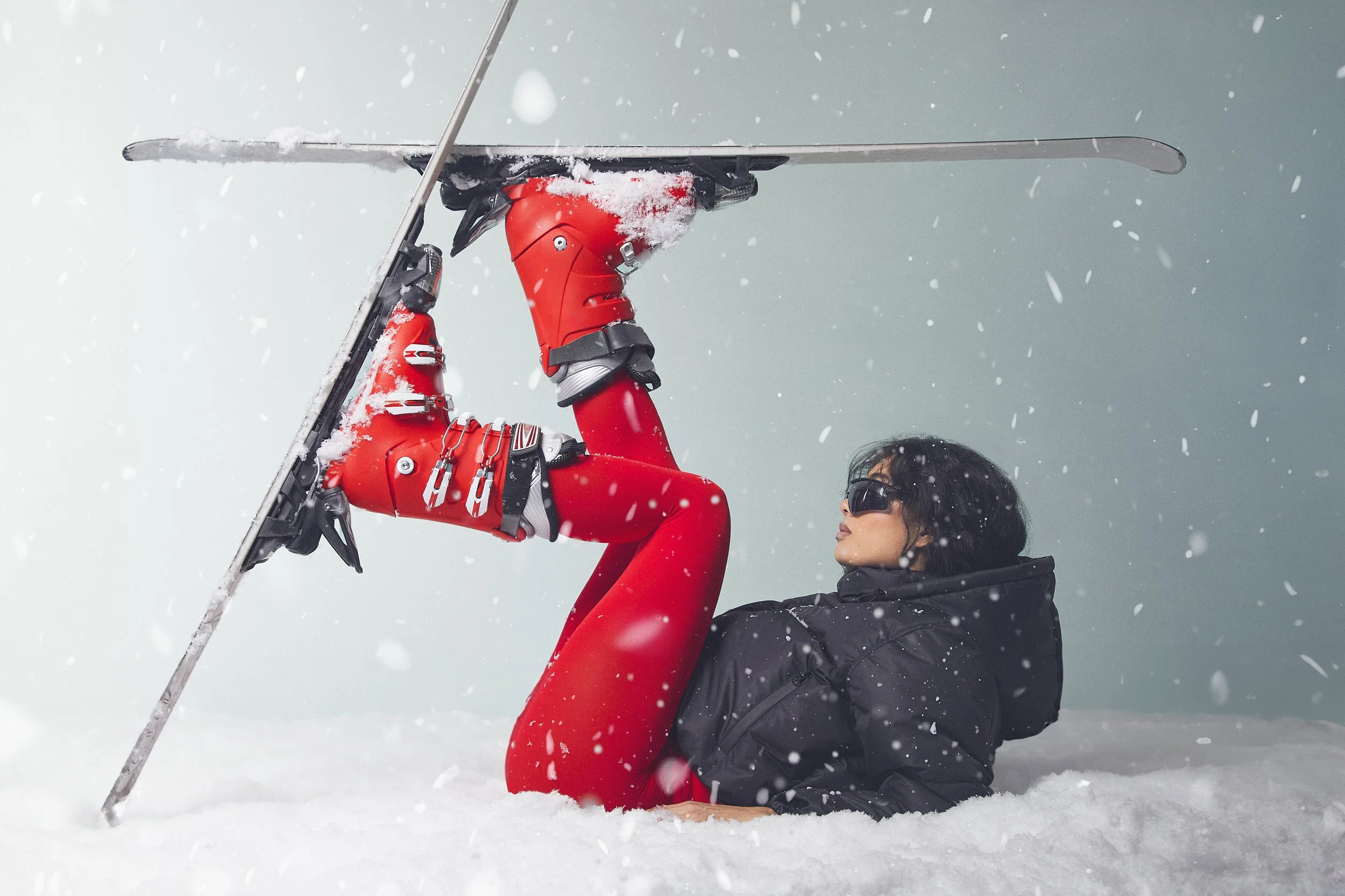 Stylish accessories including mirrored ski goggles and pom-pom snow boots, providing the perfect finishing touches for the fashion-conscious skier.