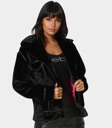 Vegan, leather trim, faux fur jacket, $166.99, bebe.com